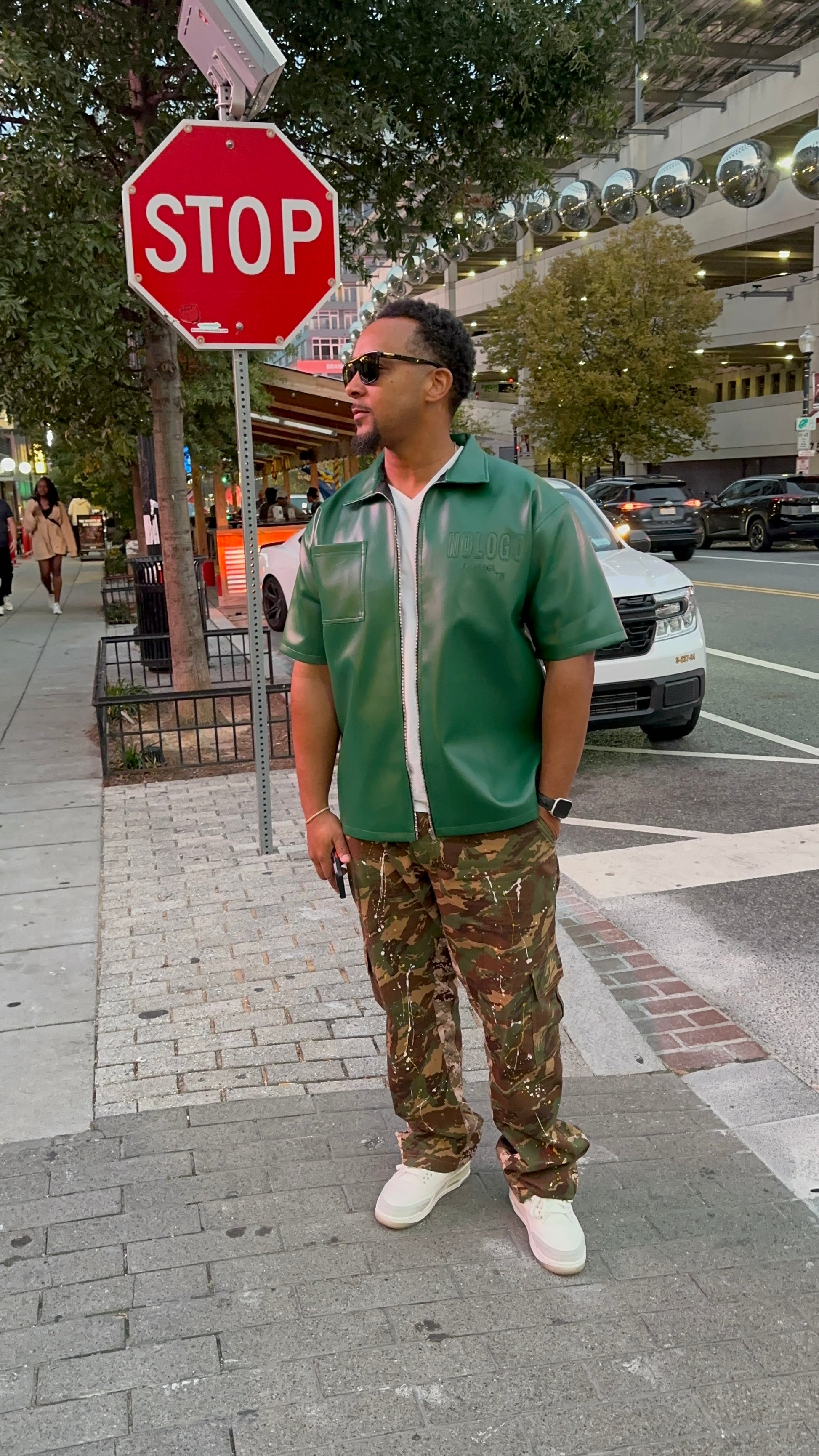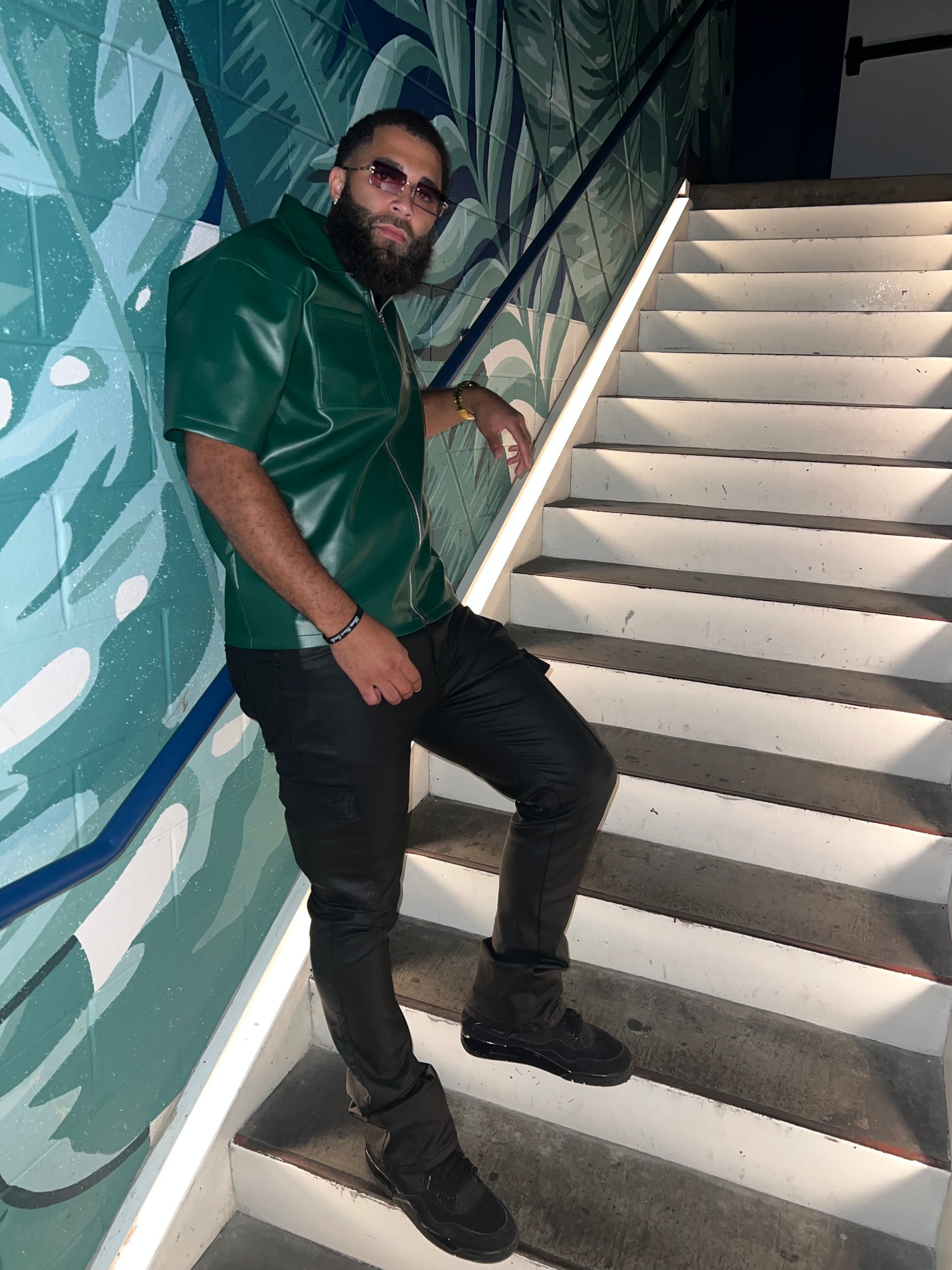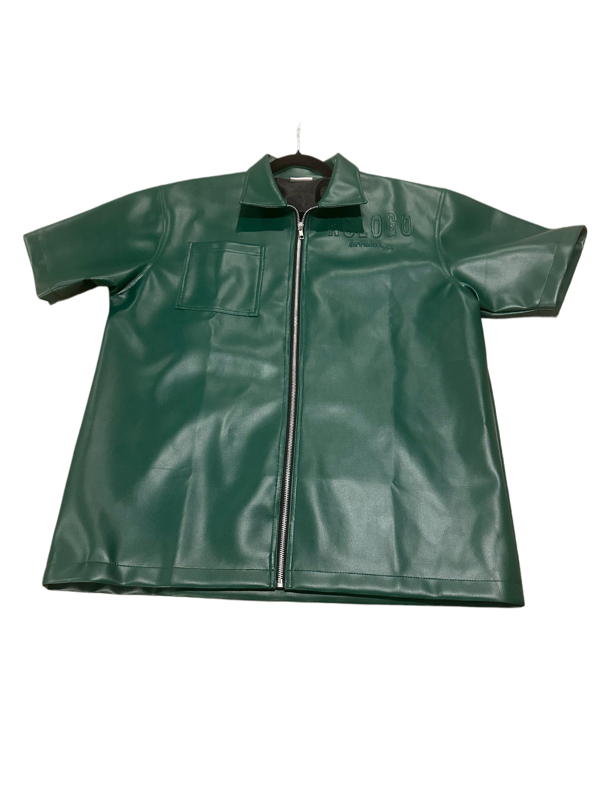 NoLoGo green leather zip up jacket. This luxury green leather short sleeve zip up features stitched logos on the chest and back, adding a touch of sophistication to your wardrobe. Made with high quality leather, this piece is both stylish and durable. Elevate your style with this expertly crafted garment.