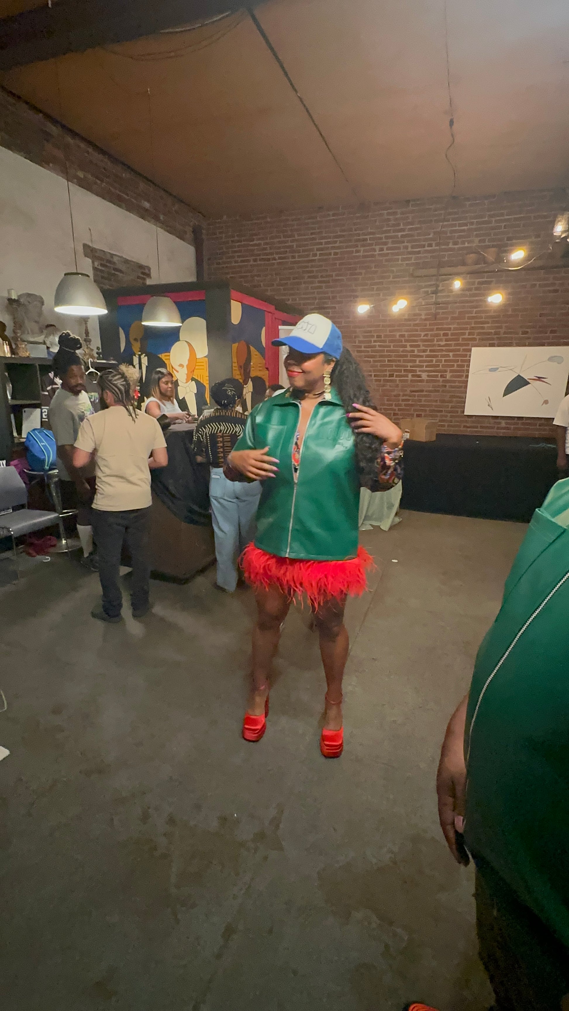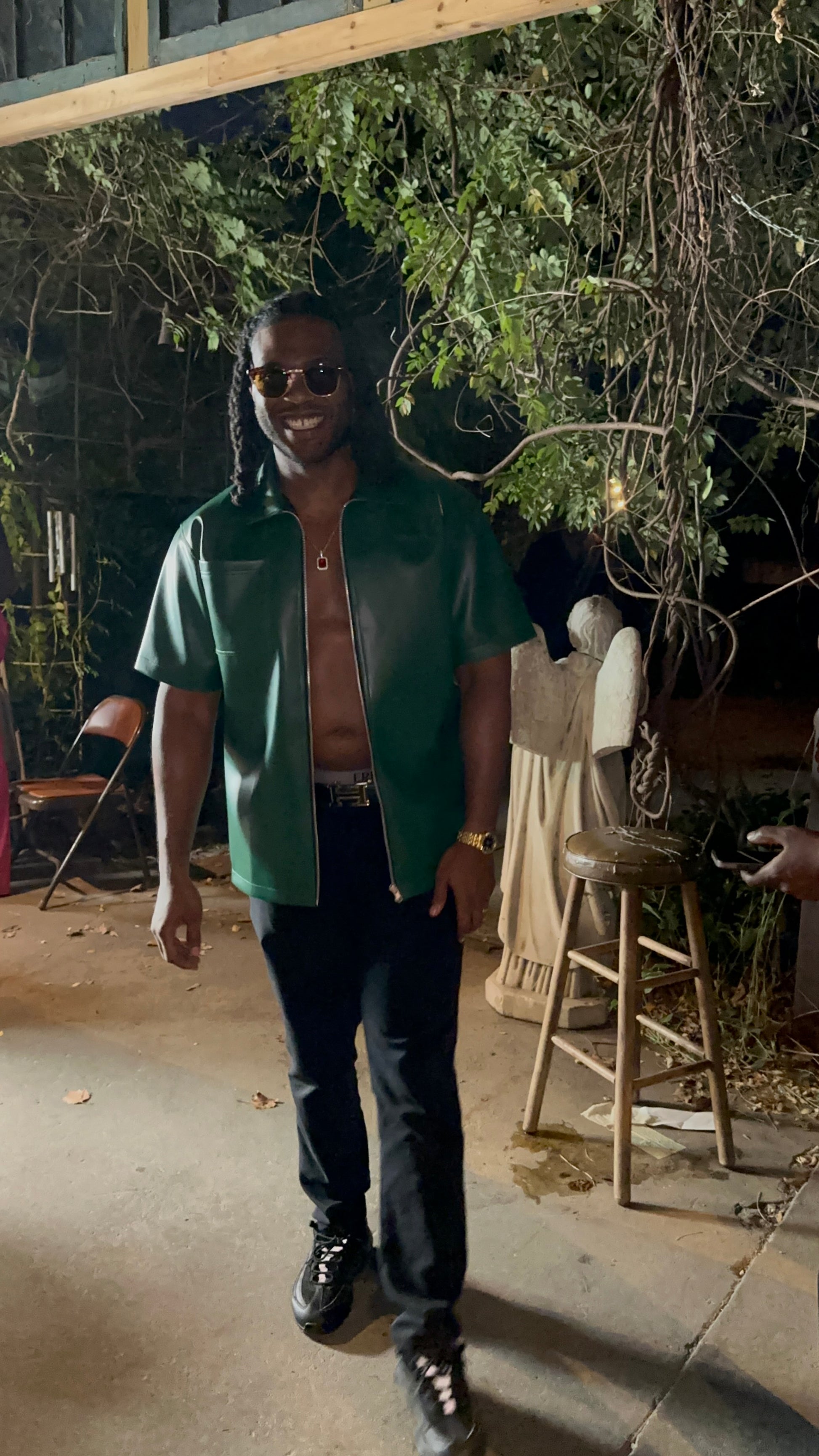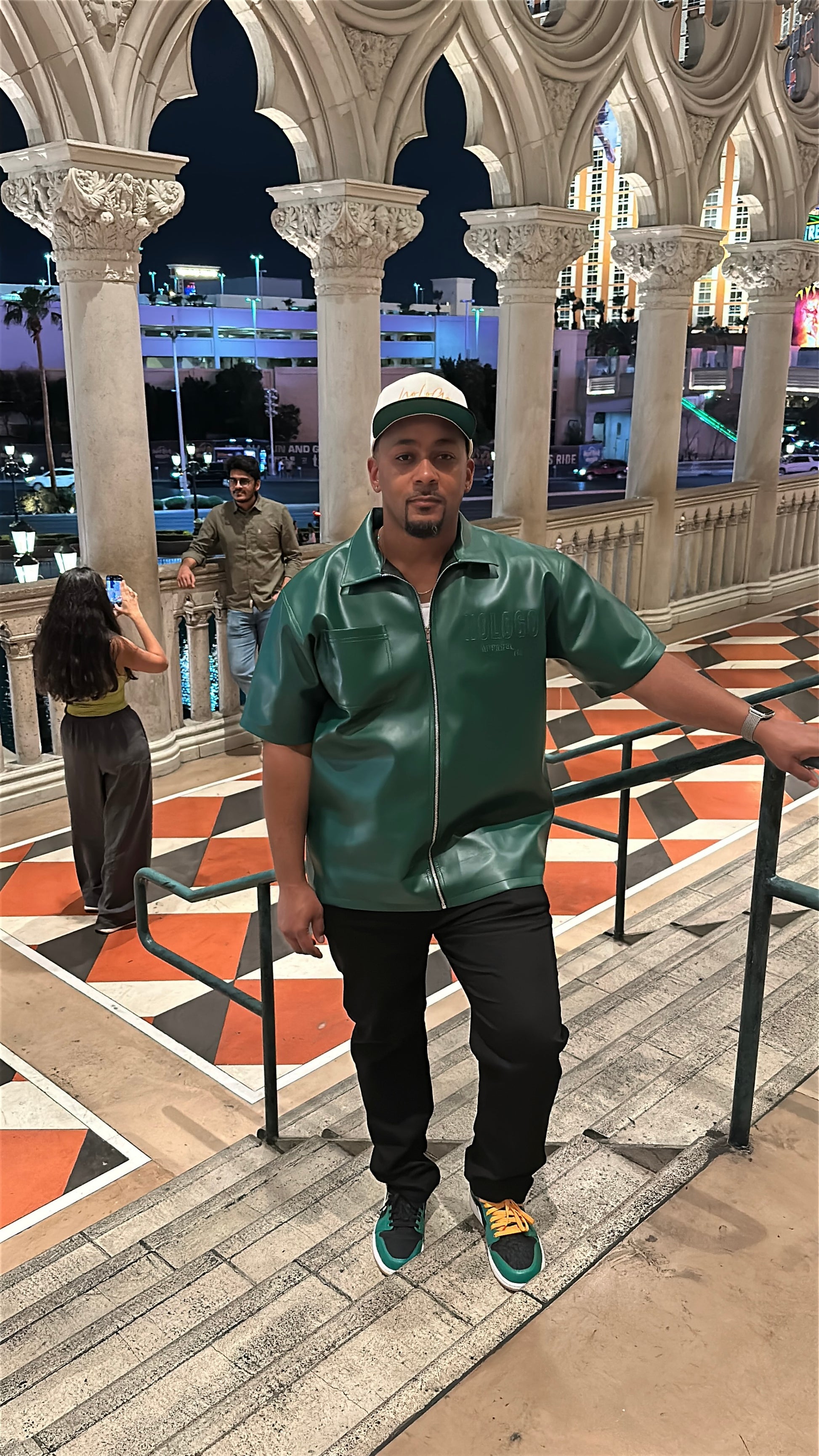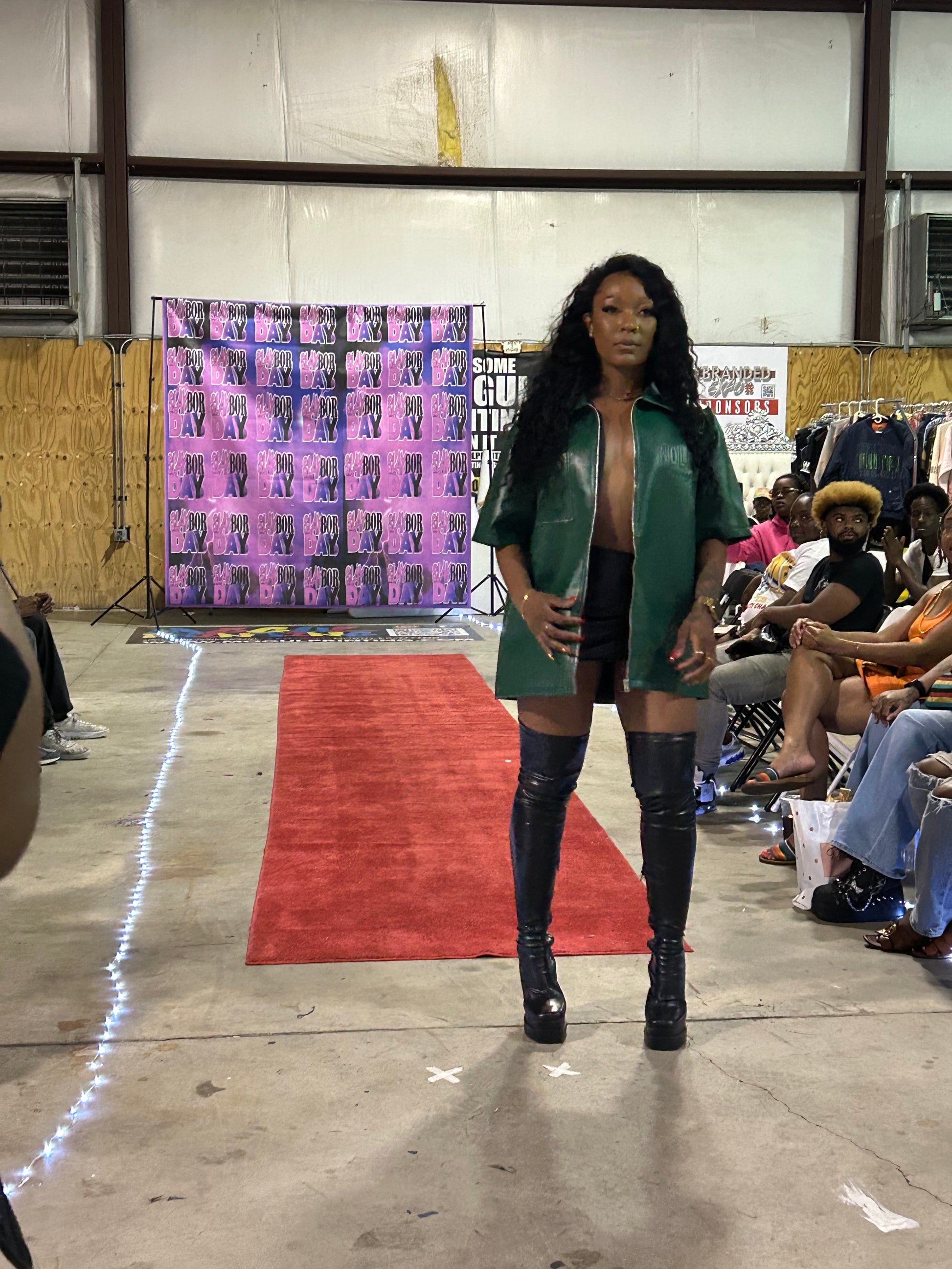 NoLoGo green leather zip up jacket. This luxury green leather short sleeve zip up features stitched logos on the chest and back, adding a touch of sophistication to your wardrobe. Made with high quality leather, this piece is both stylish and durable. Elevate your style with this expertly crafted garment.